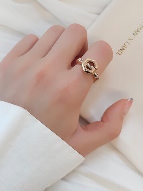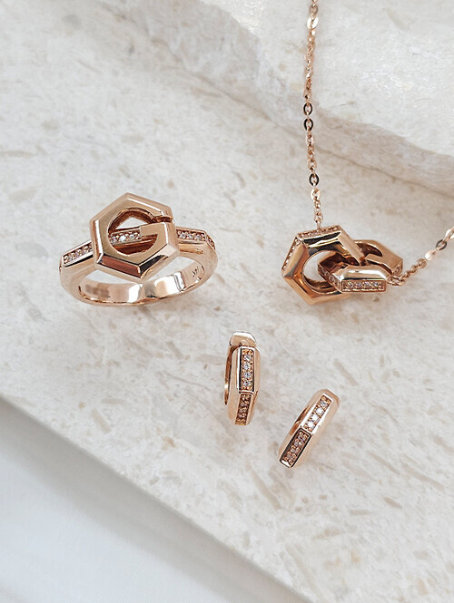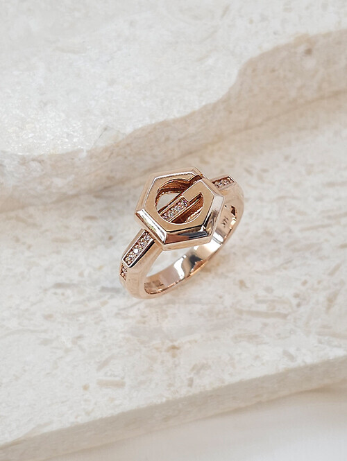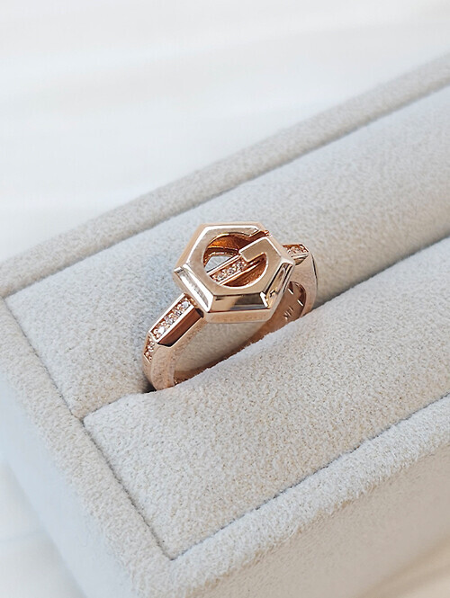볼륨감있는 G 육각 쉐입이 손가락에서 포인트가 되는 감각적인 무드의 반지
