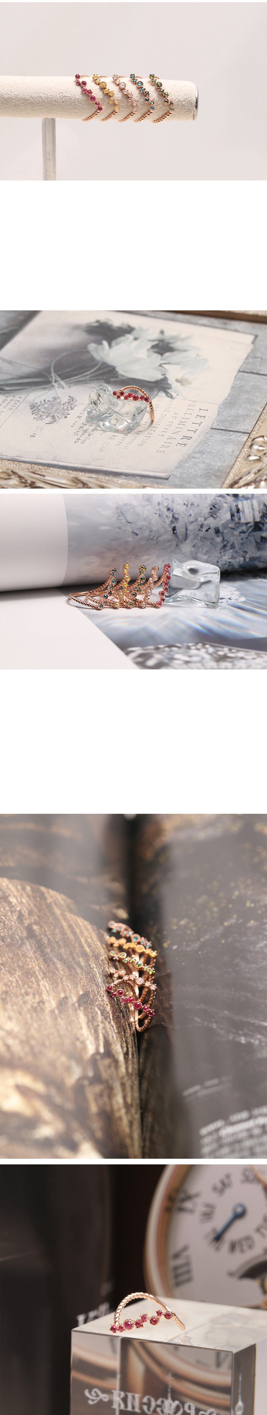다섯 가지 원석이 세팅되어 있는 반지로 골드 컬러와
